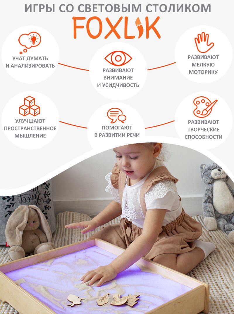 Световой планшет для рисования песком FOXLIK — это развивающая игрушка нового поколения, которая увлекает ребёнка с первых минут и делает обучение простой и естественной игрой. Вместо мультиков и гаджетов — спокойное творчество, тактильные ощущения и магия светящейся песочной поверхности.