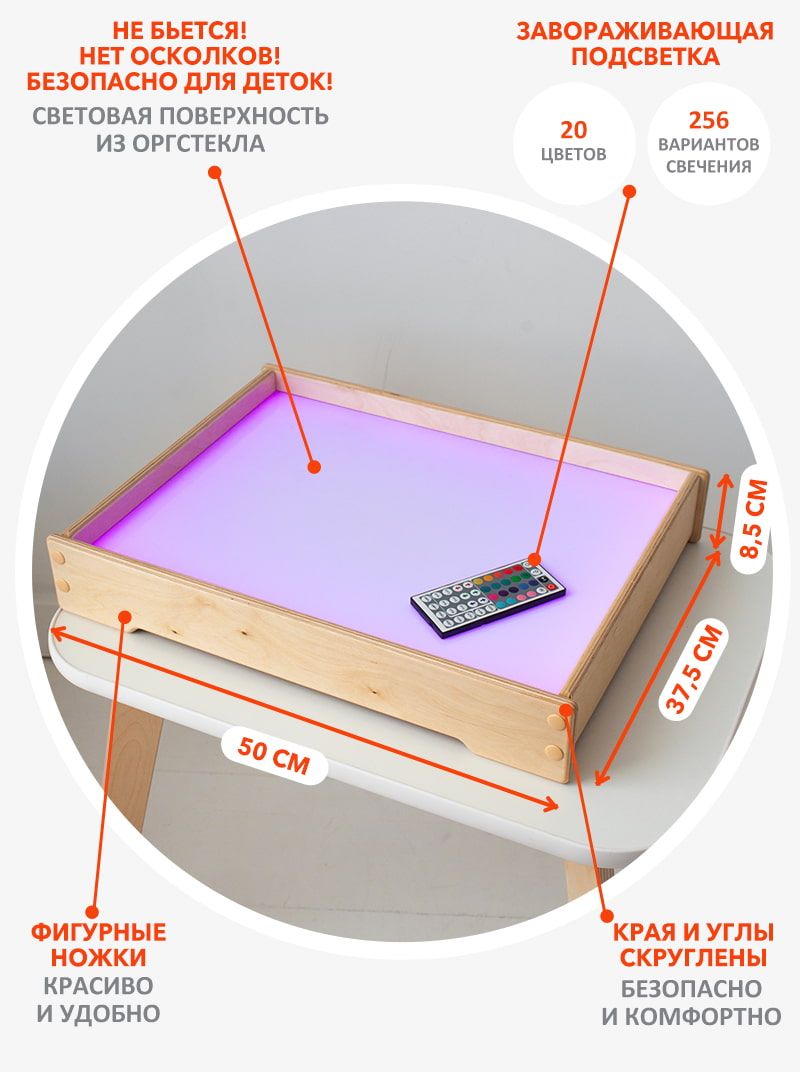 Планшет изготовлен из натуральной берёзовой фанеры, края и углы сглажены — можно использовать без присмотра. Световая поверхность выполнена из оргстекла — не бьётся и не образует острых осколков.